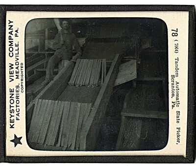 In this image, an anthracite coal mine worker can be seen supervising the use of a tandem automatic slate picker. Scranton, Pennsylvania was a major producer of clean burning and long-lasting anthracite coal, leading to several productive mines being opened around the city. Before the automatic slate picker was implement, anthracite coal mining companies used children as young as six years old for the dangerous and often deadly work of picking unwanted slate debris from harvested coal. The introduction of the automatic slate picker arose during the public outcry against employing children, allowing for the end of child labor in the anthracite coal mining industry as well as improving efficiency and productivity in the coal breaker facilities.