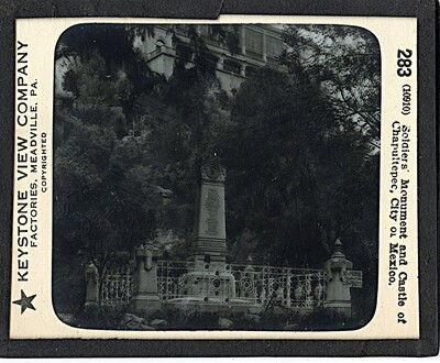 In the front of this image is a monument to Ninoes Heroes, a group of six Mexican military cadets who were killed during the battle of Chapultepec, a major battle fought during the Mexican-American War. In the background of the photos is Chapultepec Castle itself. The castle is currently a museum of national history but in the past was a royal palace.