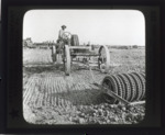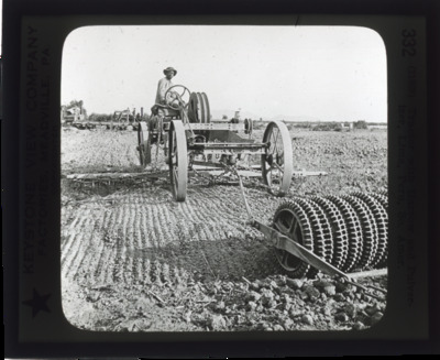 The image shows a man on a tractor, hitched to a harrow and a pulverizer. The man is preparing the soil to plant sugar cane, which was the most common crop in Peru. Sugar cane was a crop introduced to Peru by the Spaniards. Most sugar cane fields were equipped with machinery like that pictured, which was considered modern machinery for its time.
