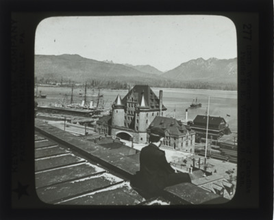 This image shows an unknown man sitting down, looking at the terminus of the Canadian Pacific Railway station in Vancouver, Canada. The Canadian Pacific Railway was built between eastern Canada and British Columbia between 1875 and 1885. The Canadian Pacific Railway was built to connect the Atlantic Ocean to the Pacific Ocean of Canada.