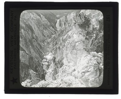Yellowstone National Park is the most well-known national parks in the United States. Though known for being past due for eruption, it is very beautiful. This slide shows a photo of a steep canyon in the park with a waterfall at the top, as well as amazing, clear rock formations. It beckons anyone interested to visit Wyoming and the park to see the beauty for themselves.