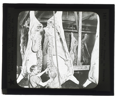 This image depicts a step in the process of dressing beef in early twentieth century Chicago, Illinois. One of the many hanging cow carcasses is getting a boiling water brush by the worker. Other carcasses await this step in the process.