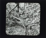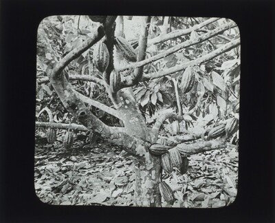 The view here shows growing one of the leading products of the island. It is from the fruit of these cacao, cocoa, or chocolate trees that commercial chocolate is made. The trees are short and stubby, and the fruit grows directly out of the branches on a short stem.