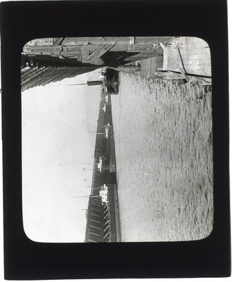 Here we can view what seems to be a view of ore docks. This slide is a great example of what was used to load ore to be transported. Including the models of boats used as well as the machinery.