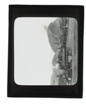 A black and white image of a steam powered threshing machine in operation In the Red River Valley of North Dakota. Men operate the machines by filling them with wheat from horse drawn carts.