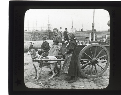 Two young girls making milk deliveries with their large hound in Antwerp, Belgium. Dog drawn cart were common in the 19th and 20th century in France, Belgium and the Netherlands. They were commonly used to transport milk from dairies to urban and rural areas.